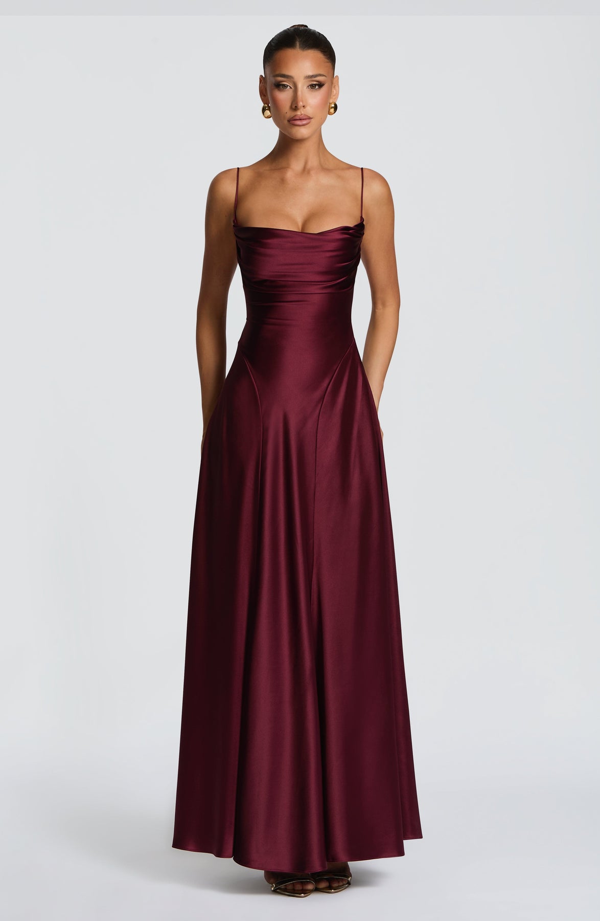 The Adelina Maxi Dress in Cherry Lacquer is crafted from luxurious non-stretch satin, this floor-length piece features a twisted cowl neckline with delicate spaghetti straps and a striking open lace-up back. The flared silhouette is enhanced by godet panels at the hips, creating graceful movement and dimension.